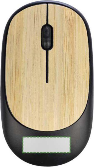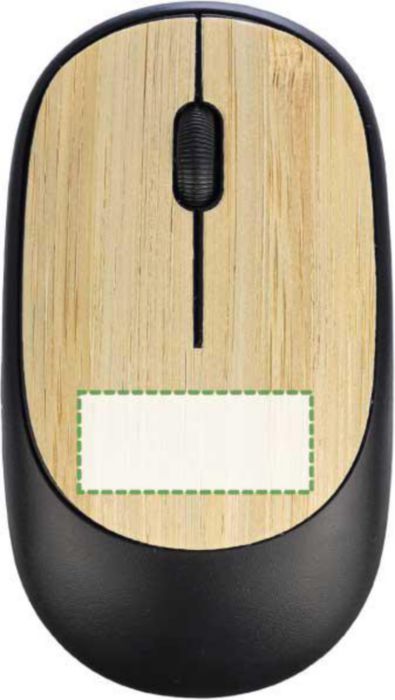 Kabellose ABS-Maus mit Bambus-Details. Inklusive Batterie. 2,4 GHz mit USB-Empfänger und 1.200 DPI. Einzeln verpackt in einer braunen Pappschachtel.