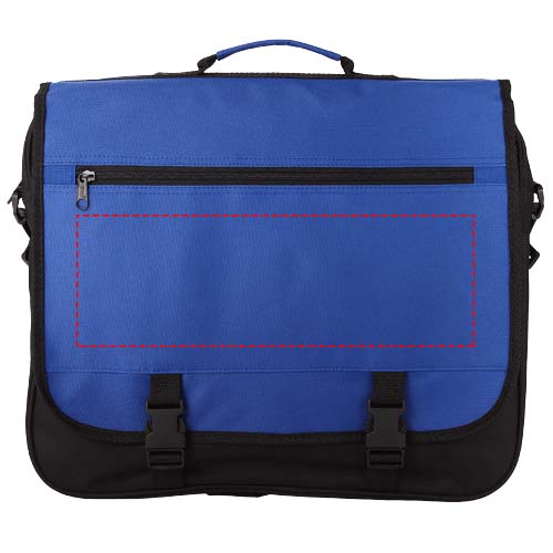 Messetasche mit einstellbarem Schulterriemen, Klappe mit Schnallenverschluss, Reißverschlussfach in der Klappe, Hauptfach mit Reißverschluss und mehreren offenen Fächern unter der Klappe.