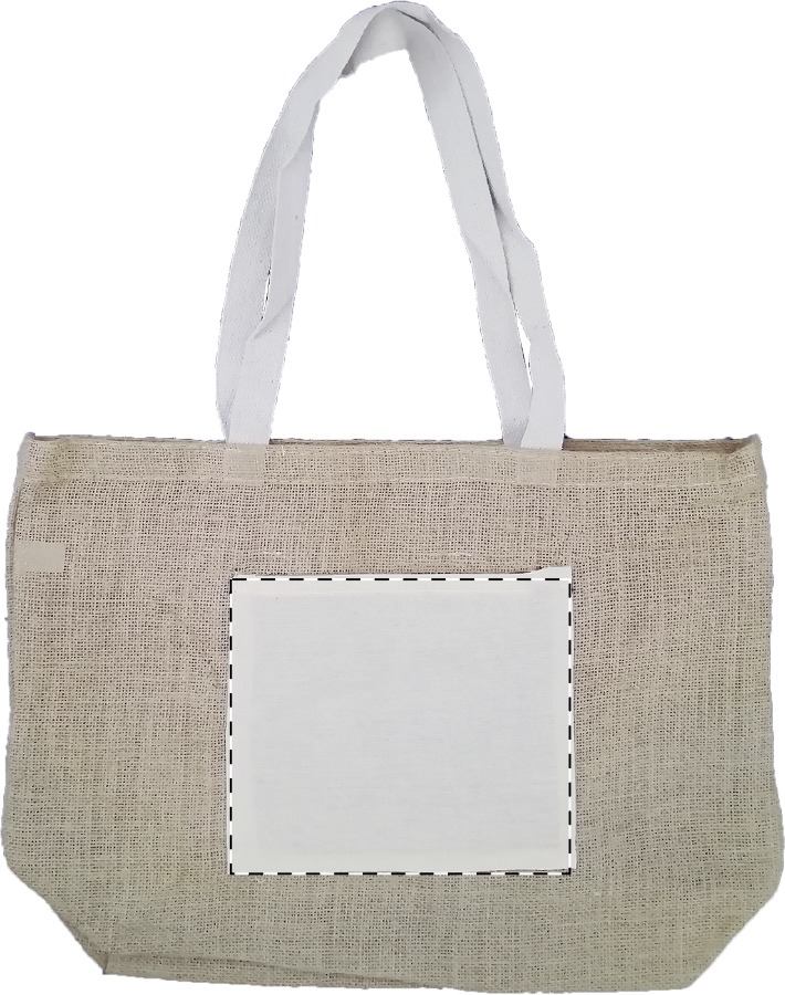 Jute-Strandtasche mit farbig abgestimmten Henkeln und Seitentasche.