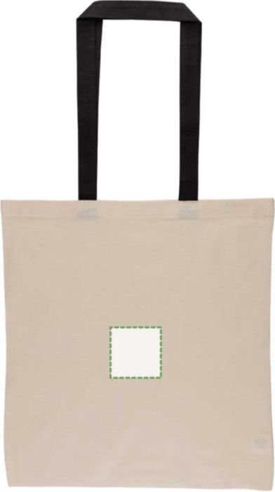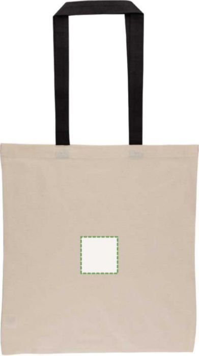 Einkaufstasche aus Baumwolle (140 g/m²) in Naturfarbe mit farbigen Griffen. Größe 38 × 42 cm mit 70 cm langen Griffen (2,5 cm breit). Dieses Produkt ist OEKO-TEX® STANDARD 100 zertifiziert.