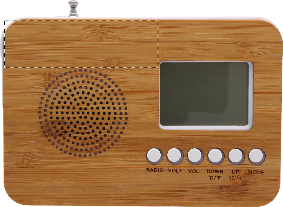Bambus-Tischuhr mit FM-Radio, Thermometer, Kalender und Weckerfunktion. Exkl. Batterien (2 x AAA).