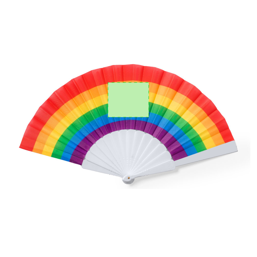 Regenbogenfächer mit mehrfarbigem Stoff und weißen RPET-Rippen. Ein Fächer, der sich sehen lassen kann, mit dem unverwechselbaren, in Form gespritzten RPET. Präsentiert in einer individuellen weißen Schachtel mit Sichtfenster.