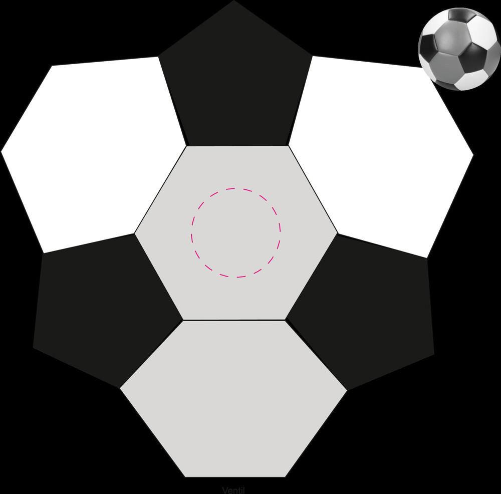 Ein Fußball der auffällt! Maschinell genähter Fußball aus PVC in den Farben weiß, schwarz und grau. Größe 5. Der Ball ist 3-lagig und hat 32 Panele inkl. einem Doppelpanel. Er verfügt über eine Dicke von 2,0 mm, ein Butyl-Ventil und eine Latex-Blase. Gewicht: 330-360 g.